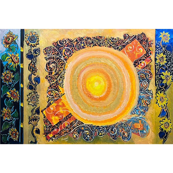 ‘Golden Harmony” captures the warmth and energy of the sun, radiating light and life. The swirling patterns and rich golden tones reflect a deep connection between nature and tradition, while the surrounding floral and ornamental elements add a sense of balance and beauty. This painting creates a feeling of harmony, where light, color, and intricate details come together in a dance of unity and warmth.