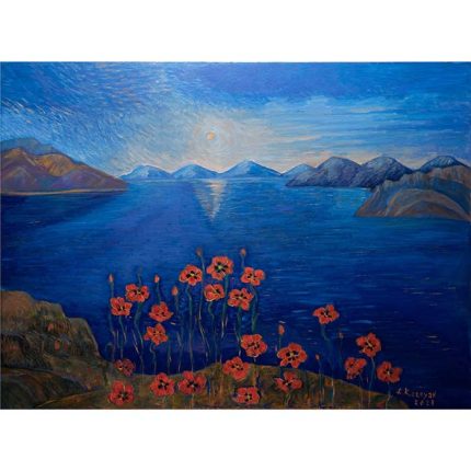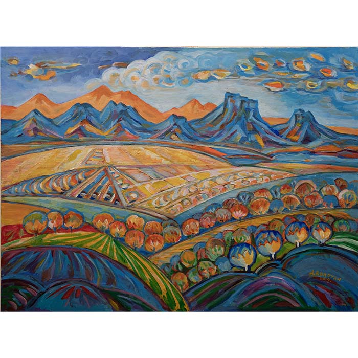An ode to Armenia’s rich landscapes, this vibrant composition brings to life the harmony of mountains and fertile fields. With bold colors and rhythmic forms, the painting celebrates the enduring connection between nature, culture, and the artistry of the land.