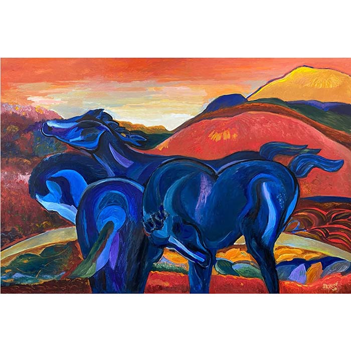 In this painting, I aimed to capture the majestic energy of nature through the powerful presence of dynamic horses set against a surreal landscape. The vivid colors and flowing lines create a sense of movement and life, celebrating the raw beauty of the natural world. This piece is a tribute to the vitality and emotional depth of the landscapes that inspire me.
