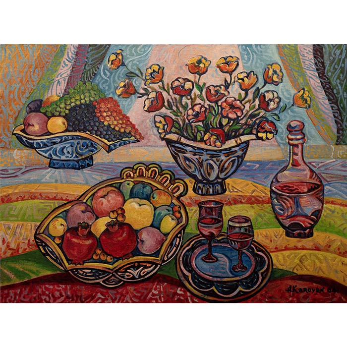 The centerpiece is a traditional Armenian table adorned with an assortment of fruits, symbolizing the bounty of the harvest. Pomegranates, apples, and grapes create a visual feast, embodying the spirit of gratitude and connection to nature. The air is filled with the sweet aroma of ripe fruits, invoking the sensory richness of autumn.